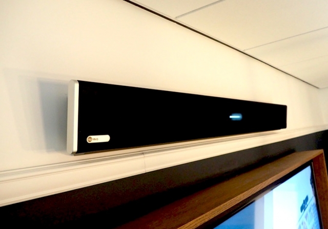 De overlegruimte ‘Museum’ hebben wij voorzien van onze opties voor draadloos video vergaderen. Deze optie adviseerden wij om te voorkomen dat er geboord moest worden in de designtafel. Om goed verstaanbaar te zijn in een wat grotere ruimte hebben we ervoor gekozen om een Nureva luidspreker/microfoon bar te gebruiken voor het geluid.